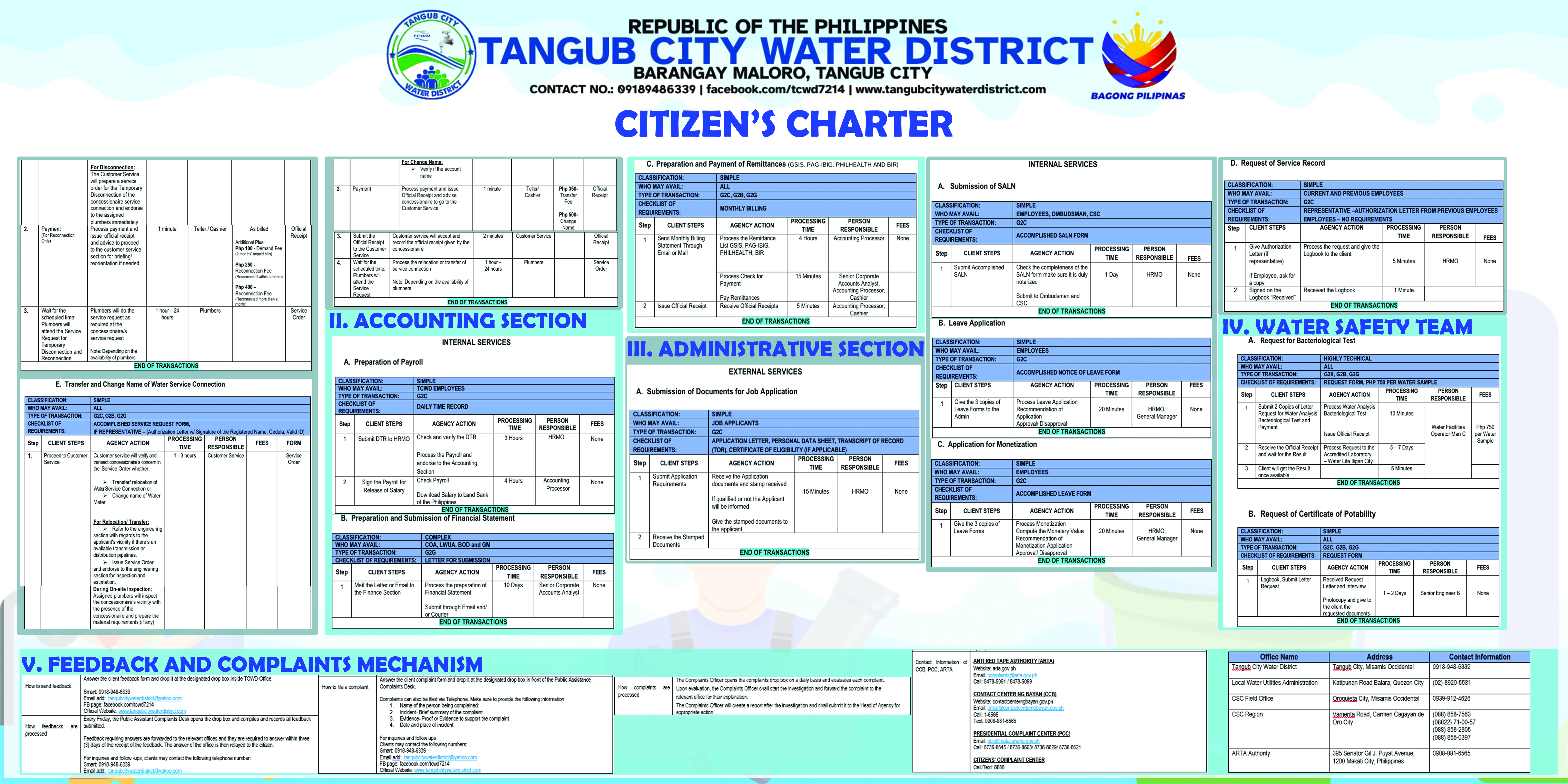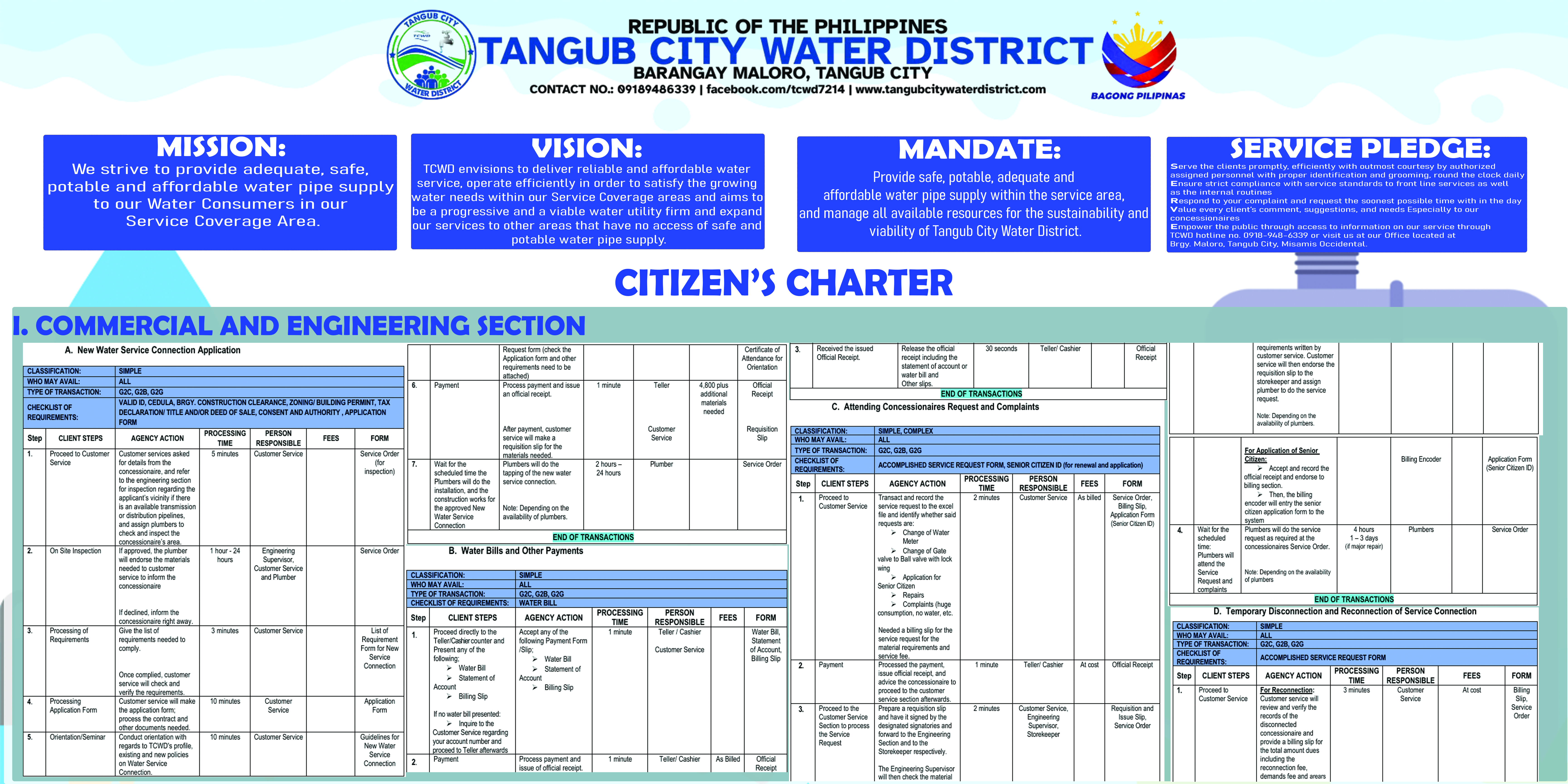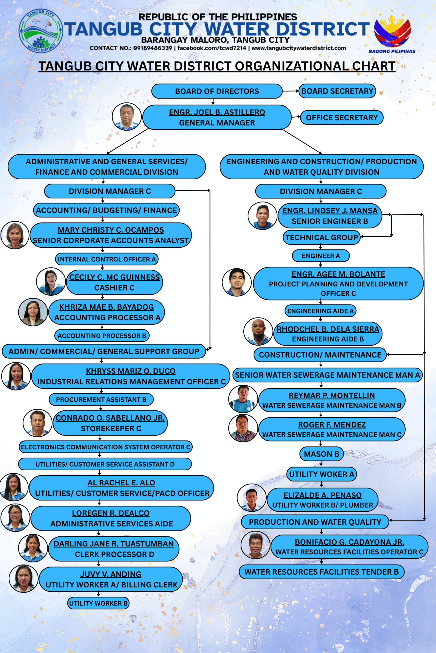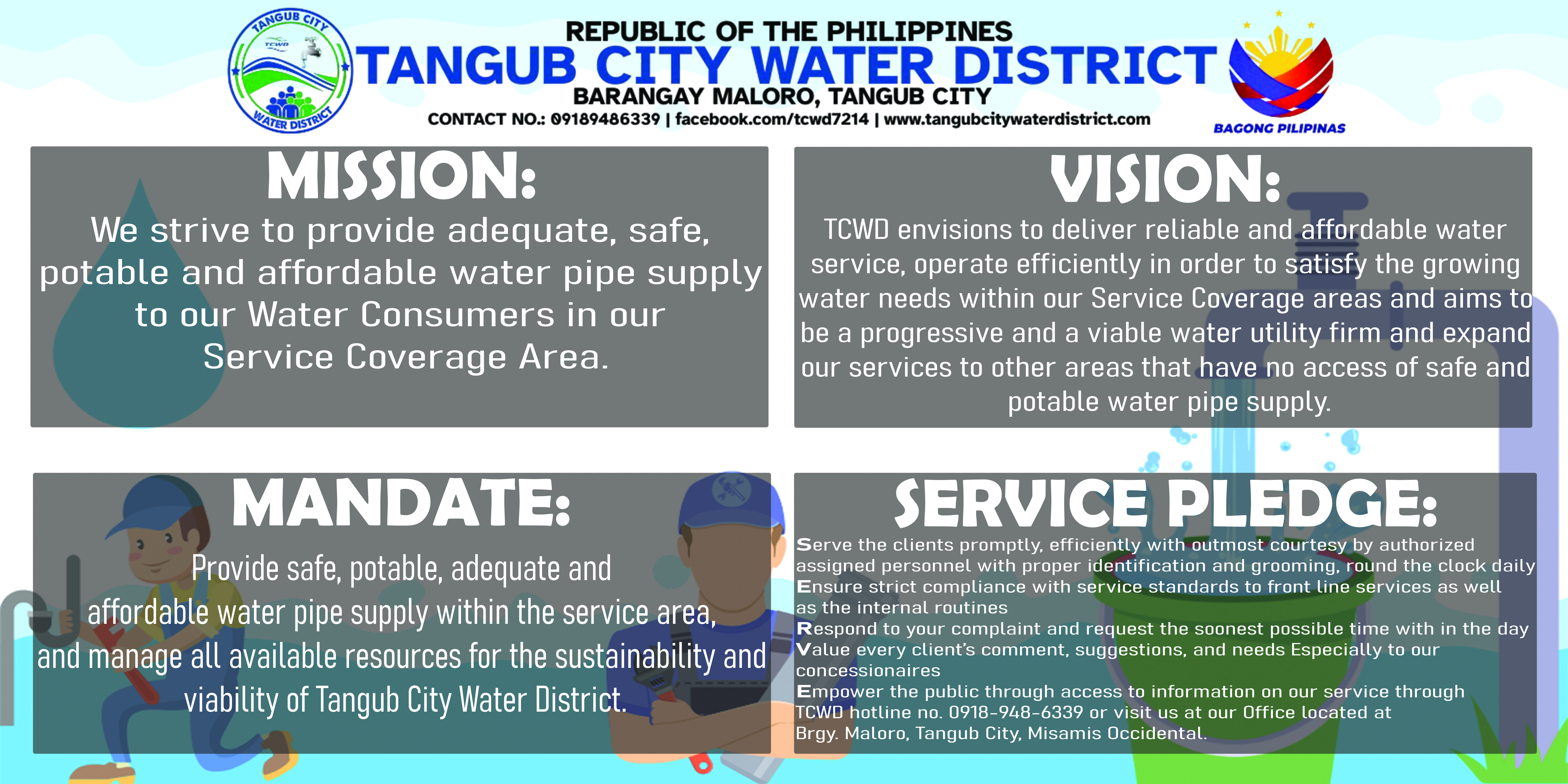 Tangub City Water District is a Government-Owned and Controlled Corporation., a public water utility firm established in 1980 through Sanguniang Panglunsod Resolution No 230 by the efforts and hard work of the City Officials lead by the late Mayor and Governor Alfonso D. Tan, based on Presidential Decree No. 198 or PD 198 known as the Provincial Water Utilities Act of 1973 a legacy program by the late President Ferdinand E. Marcos.